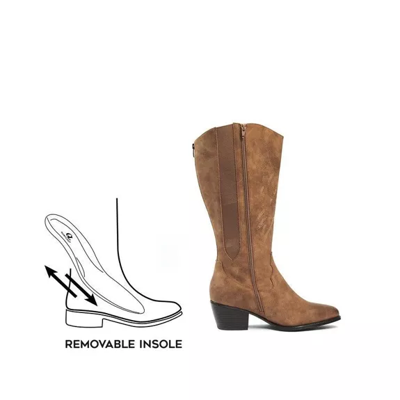 Une paire de Bottes Santiag mollets larges 2XL Irina taupe de Gabylou, une botte tournée vers l'avant et l'autre présentant la fermeture éclair latérale et le talon. Mode Grande tailleBottes Santiag mollets larges 2XL Irina taupe de Gabylou : une botte marron à hauteur du genou avec un talon bas, présentant un diagramme de sa semelle intérieure amovible. Mode Grande tailleTableau des pointures pour Bottes Santiag mollets larges 2XL Irina taupe - Gabylou, avec indication des mesures du pied en EU, US, UK, et CM/IN pour les pointures 37-43. Mode Grande taille