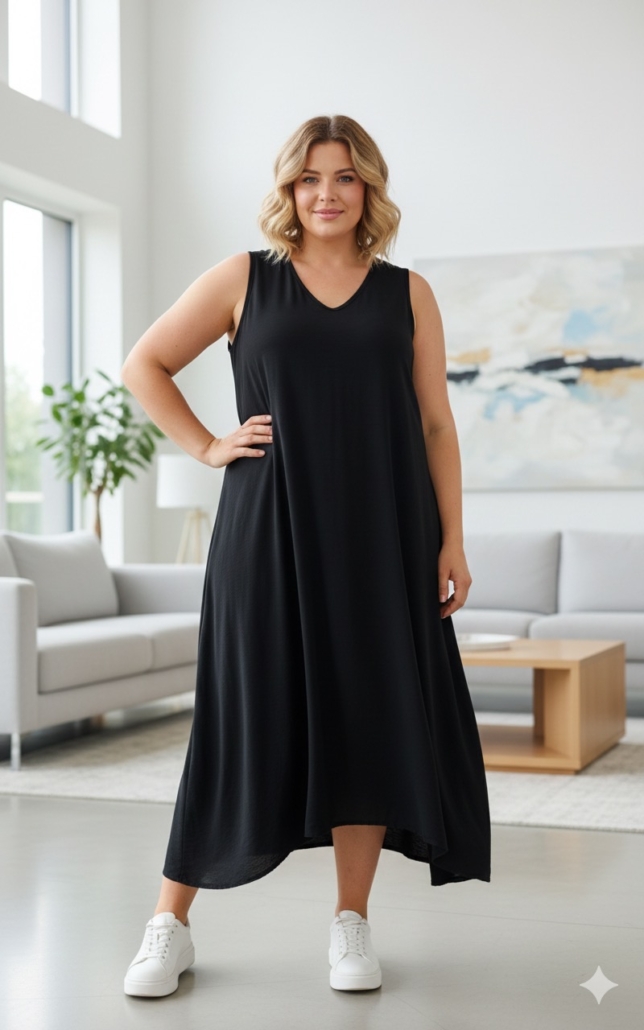 La robe “zéro prise de tête” qui fait toujours son effet. Cette robe débardeur longue noire, c’est le basique ultra flatteur à avoir sous la main : elle allonge la silhouette, tombe joliment sur les courbes, et se porte aussi bien en mode chill qu’en version plus habillée selon les accessoires.