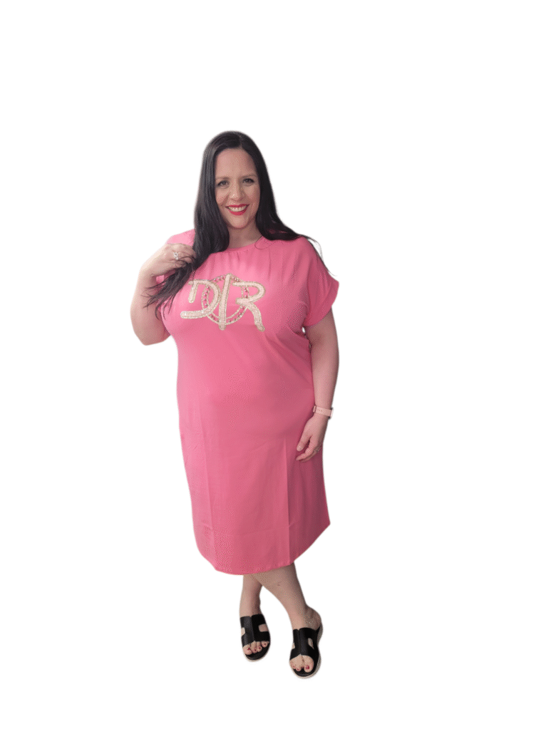 Vous êtes ici : Accueil1 / Vêtements grande taille2 / Robes et Jupes grande taille3 / Robe tee-shirt rose à inscription