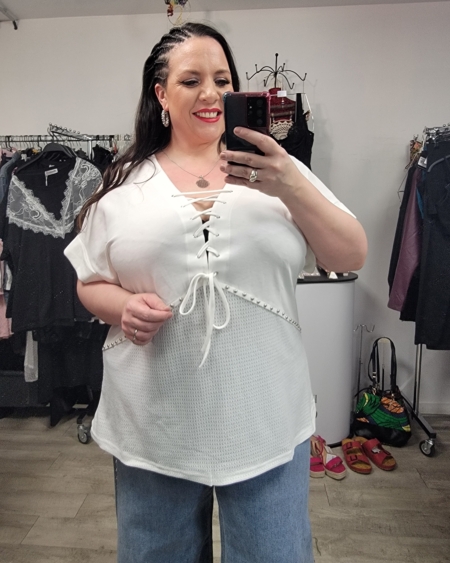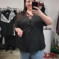Cette tunique grande taille marie subtilement deux matières pour un jeu de textures moderne et flatteur. Son décolleté laçage apporte une touche de sensualité assumée, tout en restant chic et facile à porter au quotidien.